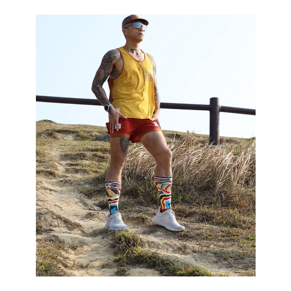 After the socks are turned over, the psychedelic flowing linear expression is used to express the eruption of volcanic lava, which represents the inner strength of the iron man ready to be unleashed. Anything is Possible. On the other hand, it also wants to express the joy and pleasure that the runners achieve in their minds during the final run. , the so-called Runner High realm.